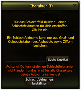 - La primera vez que accedas al campo de batalla tienes que escoger un nombre. Atención: este es válido para la cuenta. Será el nombre que lleves con todo personaje con el que participes en el campo de batalla, ¡así que escógelo con cuidado!